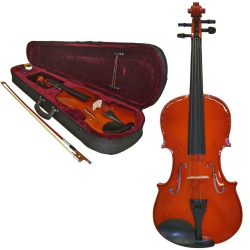 This violin kit comes complete with violin, bow, case, rosin, and a free violin tuner worth . Violin comes with a metal tailpiece with 4 tuners - making tuning easy. The bow comes with real horsehair providing solid playability and sound volume. Violin comes with bridge already setup and ready to play. Violin top is hand carved solid spruce and violin back is hand carve solid maple. The violin also comes with real inlaid purfling on both the violin top and back. Fingerboard, chinrest and tuning pegs are made out of hardwood. Bow comes with this violin kit is made out of round stick and Mongolian horsehair with rosewood frog. The kit also includes 1 rosin. The violin case is light weight made out of foam and covered with nylon. The well fitted interior design protects violin from excessive movement while in transit. Velcro neck strap holds the violin securely from movement. A matching blanket is included to further protect the violin against loose bows and items in the case. There are 2 bow holders in the case. Violin neck/head area is large enough to hold shoulder rest. There is an accessory compartment for storing rosin, strings, etc. (3" Width by 3-1/2" Length by 2-1/2" Depth). Case has outside pocket for holding music and accessories. 1 adjustable shoulder strap is included allowing carrying the case over the shoulder - taking violin to lesson, school or orchestra practice is made easy. The free tuner included is to help you tune the violin. The tuner can tune all 4 strings. The tuner is also a guitar tuner and a chromatic tuner all in one. This violin model is available in 4/4, 3/4, 1/2, 1/4, 1/8, 1/10, 1/16, 1/32 sizes. Here is a quick guide to determine the right size violin to buy by age. 4/4 Full Size (11 years old to adult), 3/4 size (10-11 years old), 1/2 size (8-9 years old), 1/4 size (6-7 years old), 1/8 size (5 years old), 1/10 size (4 years old), 1/16 size (3 and half years old), 1/32 size (3 and younger).